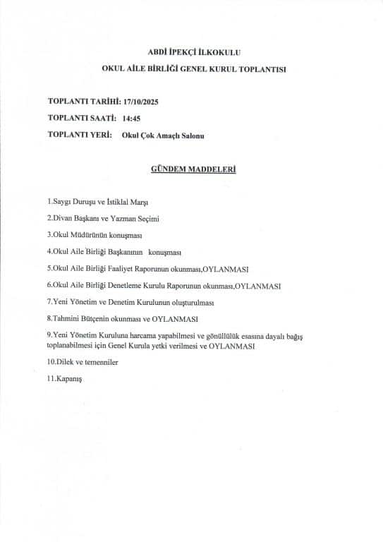 2025-2026 EĞİTİM ÖĞRETİM YILI OKUL AİLE BİRLİĞİ BAŞKANI ve YÖNETİM KURULU SEÇİMİ TOPLANTI DUYURUSU